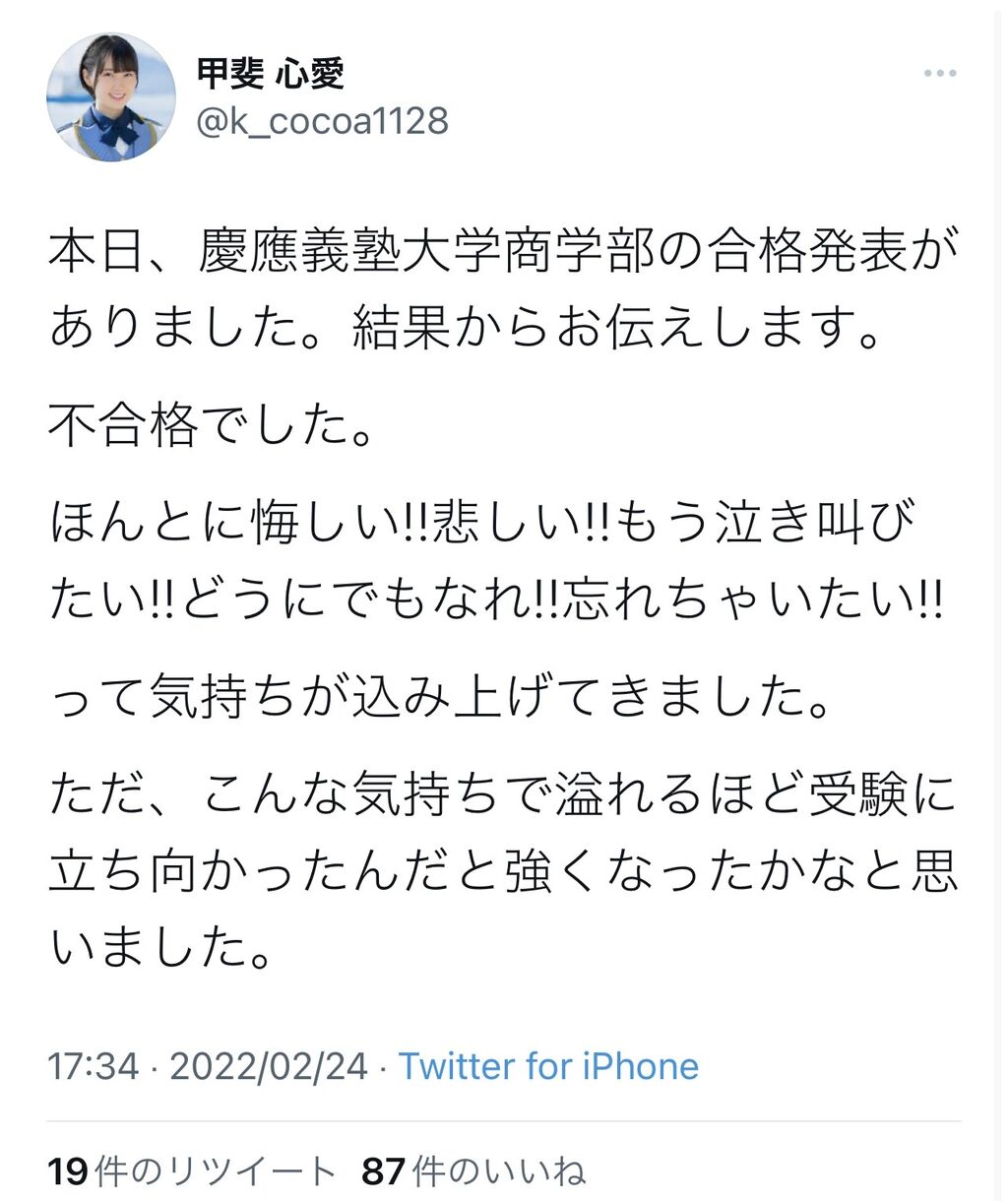 STU48甲斐心愛「慶應義塾大学商学部の合格発表がありました。不合格でした。」【STU/瀬戸内48】